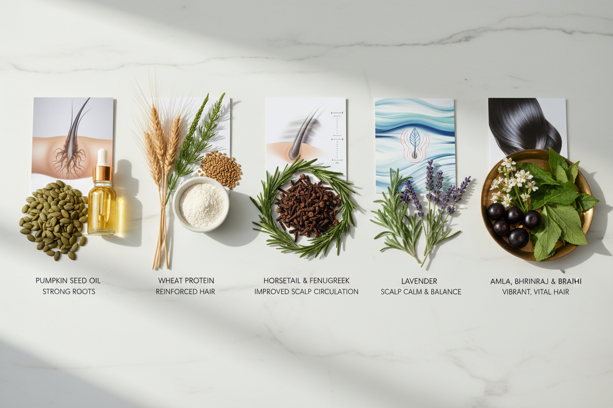 This lightweight, non-greasy formula blends pumpkin seed, grapeseed, and castor oils with a potent medley of herbal powders and leaves like amla, bhringraj, horsetail, cloves, and lavender all designed to target thinning, breakage, and lackluster strands at the root.